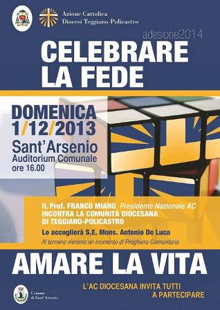 Domenica 1 dicembre 2013 ore 16,00 presso l’Auditorium Comunale di Sant’Arsenio l’Azione Cattolica di Teggiano-Policastro organizza un pubblico incontro. Interverranno: