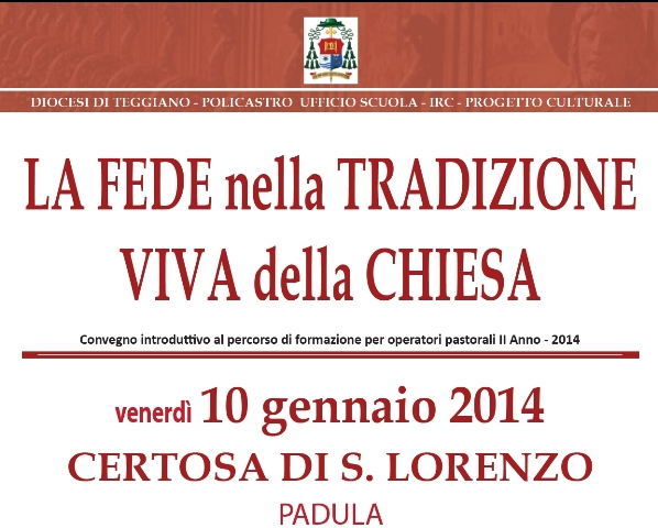 "La Fede nella tradizione viva della Chiesa", con questo tema si terrà venerdì 10 gennaio p.v. a partire dalle ore 16:30 presso l'hotel Certosa in Padula, il Convegno introduttivo al secondo anno del percorso di formazione per operatori pastorali diocesano. Interverrà, alla presenza di S.E. Mons. Antonio De Luca, il Ch.mo Prof. Dario Vitali della Pontificia Università Gregoriana di Roma con la relazione "Chiesa: Comunità di fede, speranza e carità". Sarà possibile, vista la suggestiva location dell'incontro, visitare l'adiacente Certosa di San Lorenzo accompagnati da una guida, a partire dalle ore 14:00 e fino alle ore 16:00, previa comunicazione all'ufficio turistico del Comune di Padula allo 0975 778549. Seguiranno a partire dal 15 gennaio prossimo gli incontri forianiali di formazione, come da calendario a disposizione di ciascuna comunità parrocchiale.