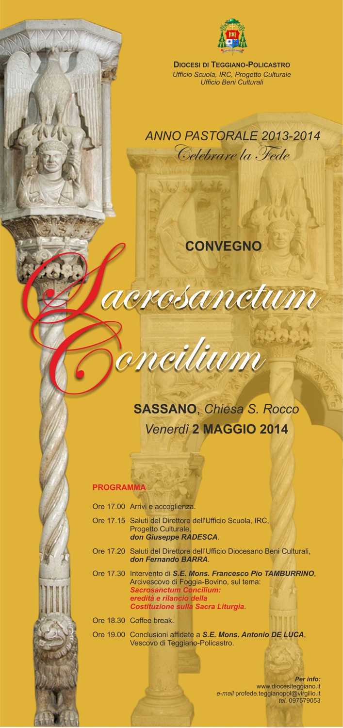 Il 4 dicembre 1963, nella III sessione del Concilio Vaticano II, veniva promulgata la Costituzione sulla Sacra Liturgia SACROSANCTUM CONCILIUM. La Diocesi di Teggiano - Policastro, venerdì 2 maggio, alle ore 17:00, presso la nuova Chiesa di San Rocco in Sassano, desidera ritornare a considerare le linee portanti della Costituzione sulla Liturgia e riflettere sulle nuove sfide che la comunicazione tecnologica lancia non solo sull’annuncio del Vangelo, ma anche al giusto modo di intendere la preghiera e il vero culto a Dio. Guiderà la riflessione S. E. Mons. Francesco Pio Tamburrino, Arcivescovo di Foggia-Bovino, già Vescovo di Teggiano Policastro e Segretario della Congregazione per il Culto Divino e la Disciplina dei Sacramenti, Redattore del Direttorio su Pietà popolare e liturgia. Dopo il saluto e l’introduzione del Direttore dell’Ufficio Progetto culturale, Don Giuseppe Radesca ci sarà l’intervento di Don Fernando BARRA, Direttore dell’Ufficio Beni Culturali. Le conclusioni saranno affidate a S. E. Mons. Antonio De Luca