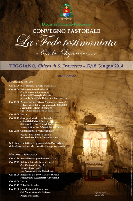 Il 17 e 18 giugno p.v. a Teggiano, presso la chiesa di San Francesco si terrà il Convegno Diocesano sul tema: La fede testimoniata: “Credo, Signore! (Gv 9,37). Il primo giorno introdurrà il prof. Domenico Santangelo, docente di teologia morale presso la Facoltà Pontificia Lateranense; seguirà una videosintesi sulle attività svolte nel 2013-2014. Dopo i gruppi di studio per foranie seguirà "Testimoni di luce - festa, animazione e testimonianze". Giorno 18 sarà ospite il Preside della Facoltà Alfonsiana di Roma, Prof. Andrej Wodka che, a partire dall’icona del cieco guarito (Gv 9), ci aiuterà a riflettere su quella testimonianza “oculare” oppure fides oculata, che Gesù dona a chi lo segue come Luce del mondo.