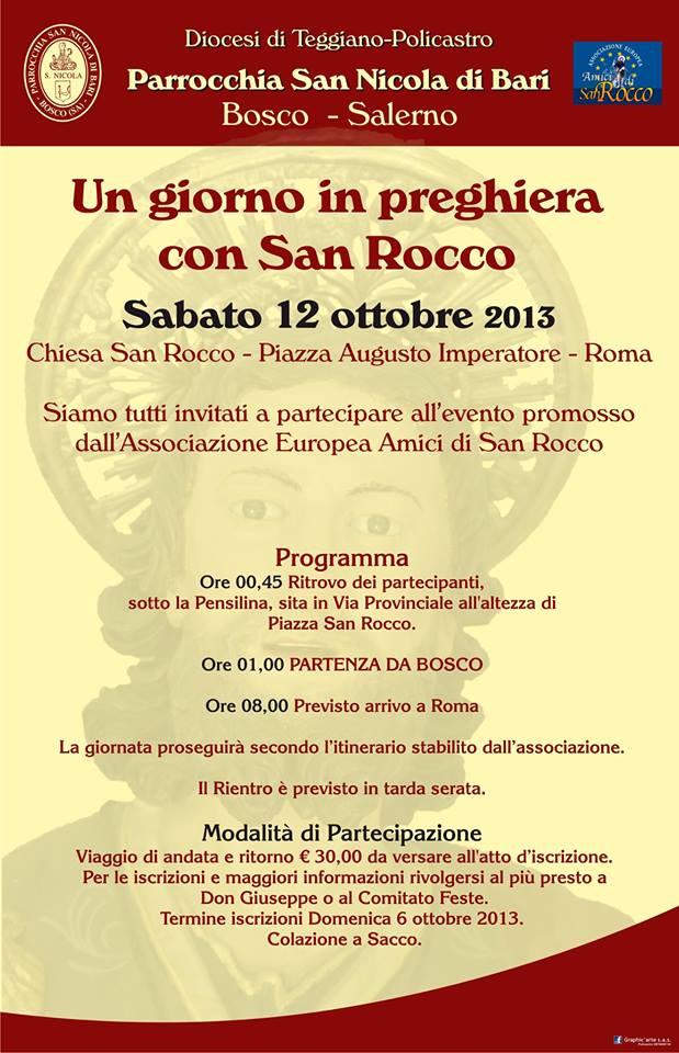 La parrocchia di San Nicola di Bari di Bosco parteciperà il 12 ottobre all'evento "Un giorno in preghiera con San Rocco" manifestazione religiosa promossa ed organizzata dall'Associazione Europea Amici di San Rocco. Il termine ultimo per le iscrizioni è fissato per domenica 6. Tutte le informazioni dei documenti allegati.