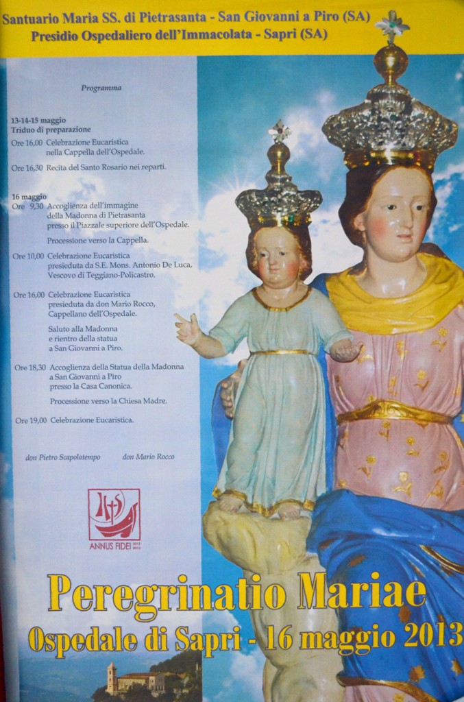 E' iniziato ieri sera il pellegrinaggio della Parrocchia di San Giovanni a Piro a Roma per l'Anno della Fede. Stamane giungeranno in Piazza San Pietro per l'Incoronazione della Madonna di Pietrasanta circa 500 devoti, provenienti dal comune di San Giovanni a Piro e da altre parti d'Italia (con in testa la comunità di emigranti di Corsico). L'udienza sarà trasmessa in diretta tv su TV2000 dalle ore 10.30. Nel pomeriggio sarà poi celebrata la Santa Messa nella Basilica di San Pietro. Il mattino dopo l'Immagine della Vergine farà visita ai malati e ai lavoratori dell'ospedale di Sapri (il programma completo in allegato). Nella serata di giovedì il gran rientro in Parrocchia a San Giovanni a Piro.
