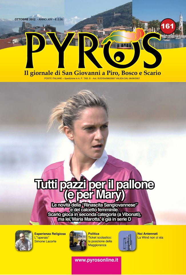 Importante riconoscimento per Maria Marotta, brillante arbitro di San Giovanni a Piro, designata per la partita dell'8 giugno tra la Nazionale degli Arbitri e la Nazionale dei Giornalisti di Rai Sport. La Marotta (nella copertina di Pyros 161 a lei dedicata), della sezione di Sapri, farà parte della quaterna assieme all' internazionale Carina Susana Vitulano della Sezione di Livorno, a Roberta De Meo di Formia ed Elisabetta Redaelli di Lecco. La partita è stata organizzata per inaugurare il nuovo campo sportivo “Consalvo” di Roma.