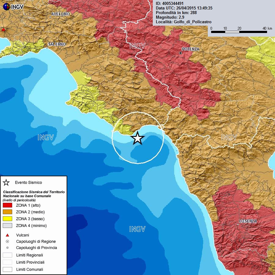 Gli strumenti dell'INGV hanno registrato nel primo pomeriggio odierno, alle 15:49, una leggera scossa di terremoto, di Magnitudo (MI) 2.9, con epicentro nei pressi della costa della Masseta nel mare di Scario, nel comune di San Giovanni a Piro. L'evento sismico non è stato avvertito dalla popolazione, vista l'elevata profondità del punto di origine del movimento, fissato dall'Istituto Nazionale di Geofisica e Vulcanologia in 288 km.