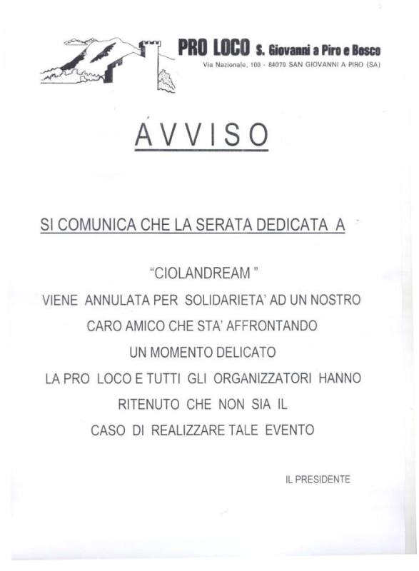 La Pro Loco San Giovanni a Piro - Bosco comunica che l'evento Ciolandream, previsto per il 15 agosto, è stato annullato "per solidarietà verso un caro amico che sta affrontando un momento delicato".