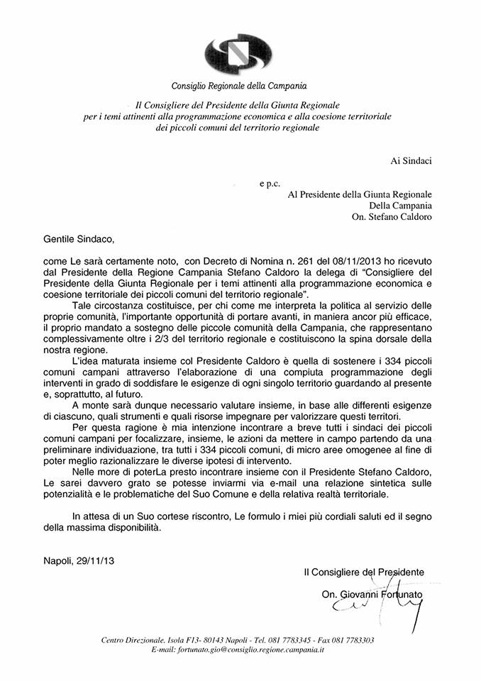 Lettera dell'On. Fortunato ai piccoli Comuni della Campania