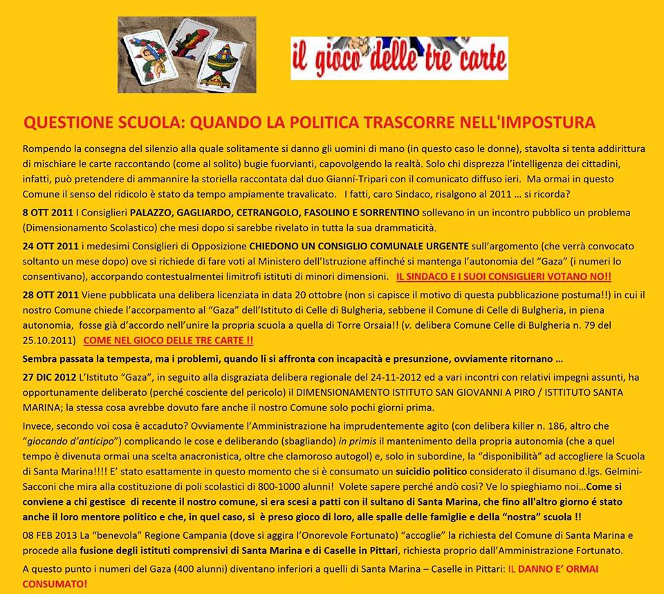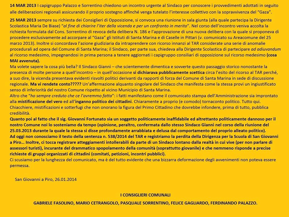 "Questione scuola: quando la politica trascorre nell'impostura". Inizia con queste parole il comunicato stampa dei Consiglieri di Opposizione del Comune di San Giovanni a Piro in risposta alle dichiarazioni dell'Amministrazione Giannì sulla notizia dell’avvenuto accoglimento del ricorso presentato al TAR di Napoli contro l’accorpamento dell'Istituto Manzoni di Santa Marina con l'Istituto Comprensivo di Caselle in Pittari. "I fatti manifestano come il comunicato stampa dell’Amministrazione sia improntato alla mistificazione del vero ed all’inganno politico dei cittadini. - dichiarano i Consiglieri - Chiaramente a proprio (e comodo) tornaconto politico".
