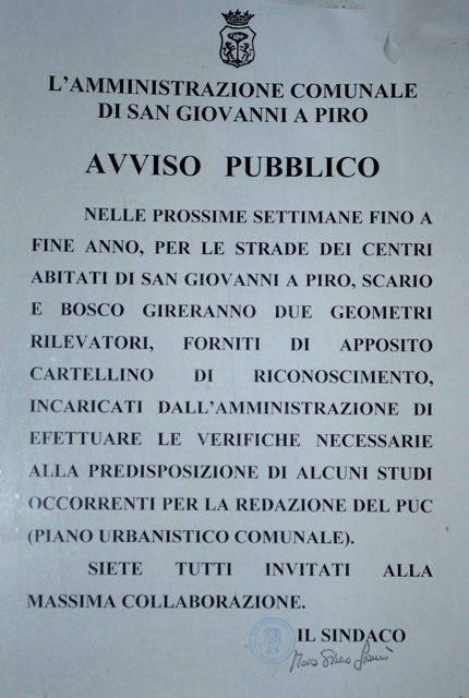 Nelle prossime settimane, fino a fine anno, 2 geometri dotati di apposito cartellino di riconoscimento gireranno tra le strade dei centri abitati di San Giovanni a Piro, Bosco e Scario, per effettuare delle verifiche per la predisposizione di alcuni studi per la redazione del PUC (Piano Urbanistico Comunale). Il sindaco invita la cittadinanza alla massima colaborazione.