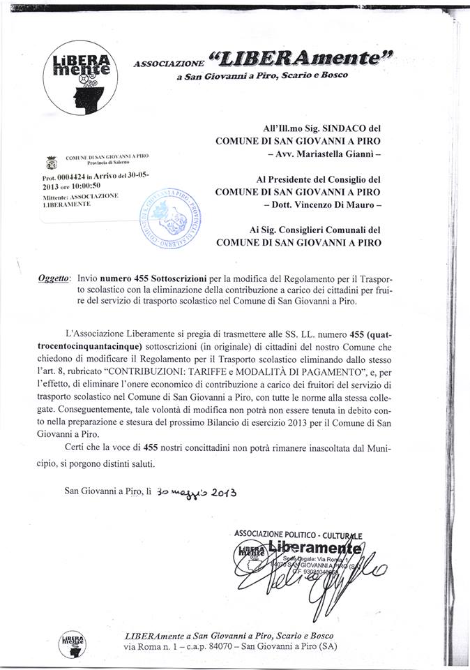 Come annunciato a fine dicembre Liberamente ha promosso una petizione contro lo scuolabus a pagamento. L'ass. politica ha raccolto 455 sottoscrizioni e le ha consegnate al comune "affinché ne prenda atto nella stesura del prossimo Bilancio 2013". Il Consigliere Palazzo afferma: "E' ora di ridare attenzione ai bambini e di riconoscere loro la giusta priorità attraverso l'erogazione gratuita dei servizi pubblici. Non solo, ma anche per eliminare qualche spesa a carico delle famiglie in questo periodo di grave difficoltà economica".