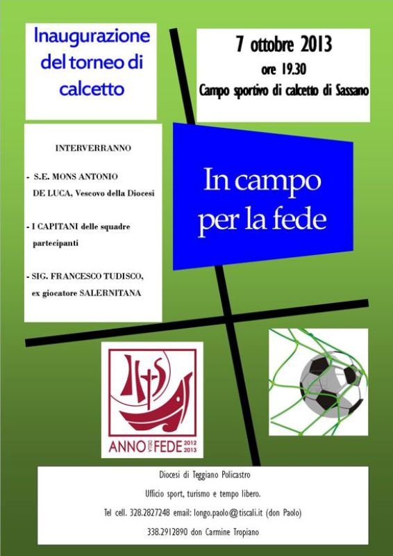 Lunedì 7 ottobre p.v., alle ore 19,30 presso il campo di calcetto di Sassano, avrà inizio il torneo di calcetto organizzato dall'Ufficio Diocesano per la Pastorale del Tempo libero, Turismo e Sport. All'inaugurazione saranno presenti il Vescovo Antonio De Luca, i capitani delle squadre e l'ex calciatore della Salernitana Francesco Tudisco.