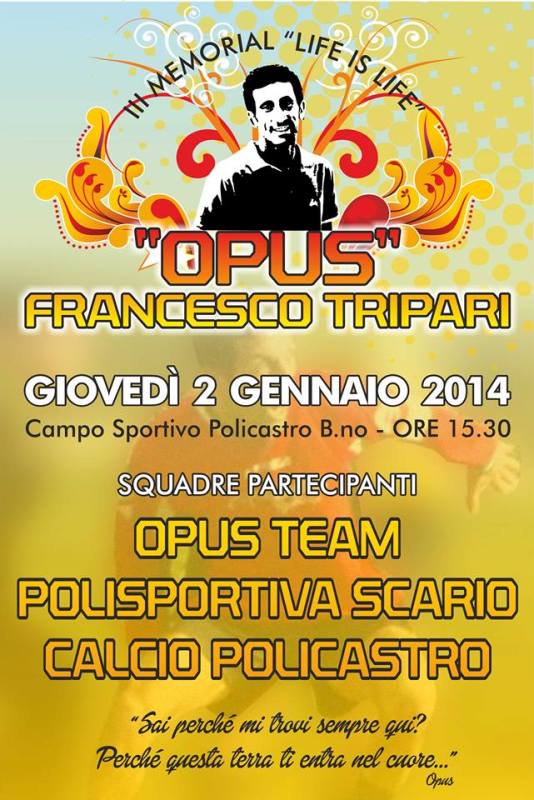 Calcio: giovedì 2 gennaio 2014 presso il Campo Sportivo di Policastro Bussentino, dalle ore 15:30, si svolgerà la terza edizione del Memorial "Life is Life". Al torneo, ideato per ricordare la figura di Francesco Tripari "Opus", calciatore e capitano dello Scario, parteciperanno l'Opus Team, la Polisportiva Scario e il Calcio Policastro.