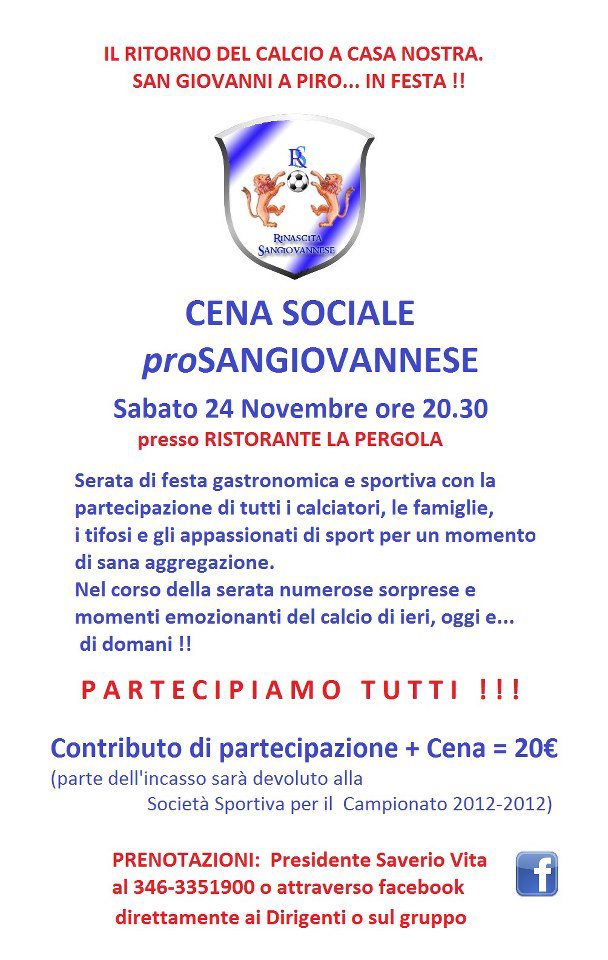 La dirigenza della Real Sangiovannese organizza una cena sociale per raccogliere fondi per il campionato di terza categoria che inizierà nelle prossime settimane. Durante la serata l'organizzazione promette "momenti emozionanti del calcio di ieri, oggi e di domani!". Il contributo di partecipazione, comprensivo di cena, è di 20€. L'evento è aperto a tutti: calciatori, tifosi e appassionati di sport; l'appuntamento è dunque per il 24 novembre alle 20,30 presso il ristorante La Pergola a San Giovanni a Piro.