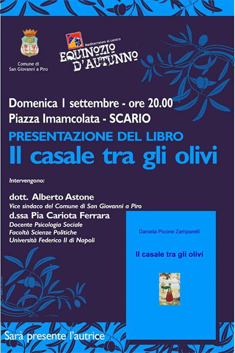 Domenica 1 settembre, nella Piazza Immacolata a Scario, alle ore 20:00, verrà presentato il libro "Il casale tra gli olivi", di Daniela Picone Zamparelli. Interverranno il dott. Alberto Astone, Vicesindaco del comune di S. Giovanni a Piro, e la d.ssa Pia Cariota Ferrara dell'Università Federico II di Napoli. Il testo racconta "due storie parallele che si alternano negli stessi luoghi, ma in spazi temporali diversi. Una narra di un giovane avvocato, smemorato, sopravvissuto alla spedizione di Pisacane che, soccorso da Filomena, conosce un vero amore e la dura vita dei contadini. L'altra, narrata in prima persona, racconta le vicende di una famiglia che elegge il Cilento a luogo dell'anima. Magicamente due vicende, lontane nel tempo e diverse per trama e registro narrativo, risulteranno strettamente collegate".