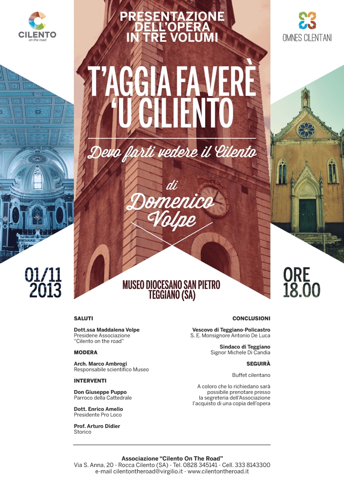 Venerdì 1° Novembre alle ore 18.00 presso il Museo Diocesano di Teggiano, si terrà la presentazione dell'opera in tre volumi: "T'aggia fa verè 'u Ciliento" di Domenico Volpe.