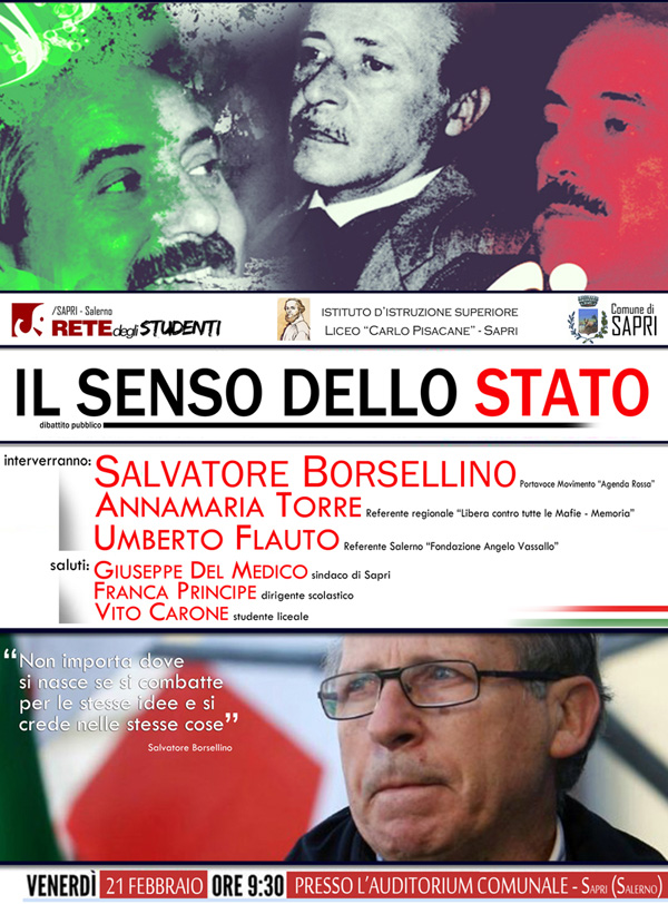 Domani, venerdì 21 febbraio, a Sapri, presso l’Auditorium Comunale "G. Cesarino", a partire dalle ore 9.30, si terrà l’iniziativa "Il Senso dello Stato". L'incontro, organizzato dal Comitato Studentesco del Liceo saprese "Carlo Pisacane", verterà sui temi legati al mondo della legalità e della lotta alla mafia. Saranno presenti: Umberto Flauto (Responsabile Salerno “Fondazione Angelo Vassallo”), Annamaria Torre (Responsabile regionale “Libera contro tutte le Mafie – Memoria”), Giuseppe Del Medico (Sindaco di Sapri), Franca Principe (Dirigente Scolastico) e Vito Carone (studente liceale). Concluderà Salvatore Borsellino, Presidente del movimento "Agenda Rossa" e fratello del noto magistrato assassinato dalla mafia.