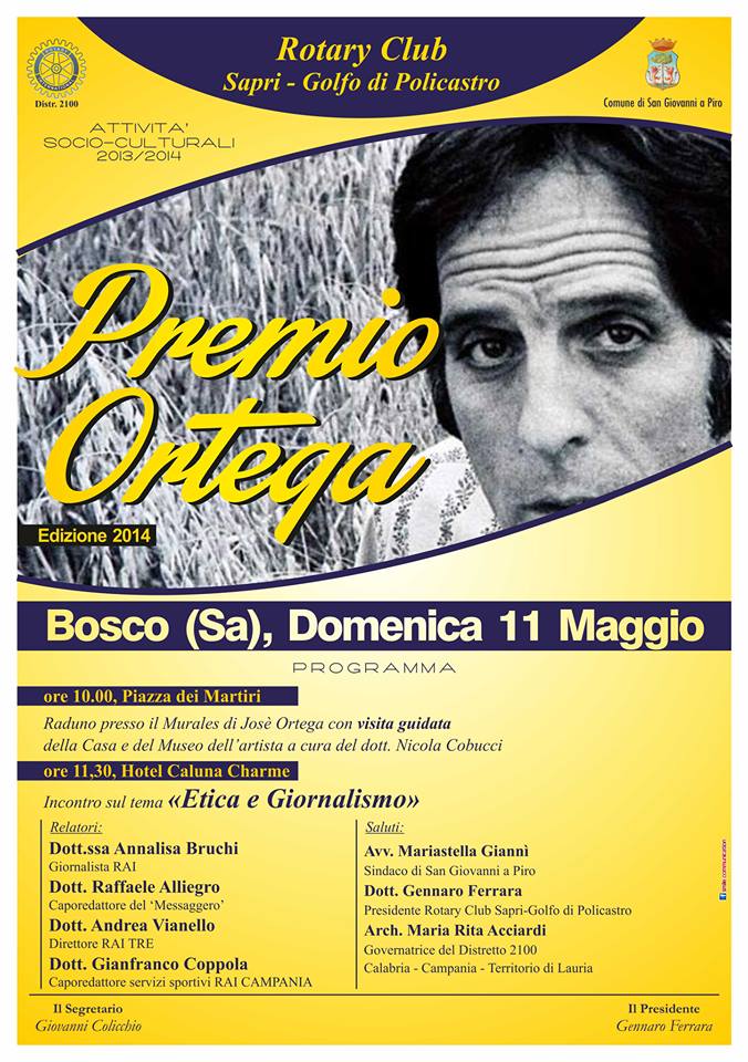 Si svolgerà domenica prossima, a Bosco, l’edizione 2014 del Premio Ortega, l’appuntamento socio-culturale organizzato dal Rotary Club Sapri-Golfo di Policastro. Quest’anno dedicato al giornalismo, il Premio verrà assegnato a quattro affermati professionisti del settore: Annalisa Bruchi – giornalista RAI, Raffaele Alliegro – caporedattore de Il Messaggero, Andrea Vianello – direttore RAI3, Gianfranco Coppola – vicedirettore servizi sportivi RAI Campania. Gli stessi, a fronte della propria solida esperienza, relazioneranno sull’attualissimo tema dell’incontro “Etica e giornalismo”. I lavori, che avranno inizio alle ore 11:30 e che si svolgeranno al “Caluna Charme”, saranno introdotti dal Sindaco di S. Giovanni a Piro Maria Stella Giannì, dal Presidente del Rotary Club Sapri-Golfo di Policastro Gennaro Ferrara e dalla governatrice del Distretto 2100 Maria Rita Acciardi. A precedere la tavola rotonda una visita guidata nei luoghi vissuti e forgiati dal pintor della Mancha, cui il Premio è dedicato.