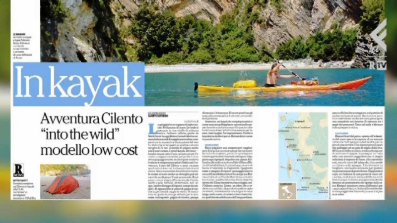 Due pagine del quotidiano La Repubblica oggi in edicola erano dedicate al viaggio in kayak nel Cilento, da Agropoli a Policastro Bussentino, passando per altre splendide località turistiche come Palinuro e Scario. Il reportage di Alberto Custodero è stato presentato nel programma RNews, il tg quotidiano di Repubblica Tv in onda su Repubblica.it e LaEffe, canale 50 del digitale terrestre e 139 di Sky. Ecco le immagini del servizio: