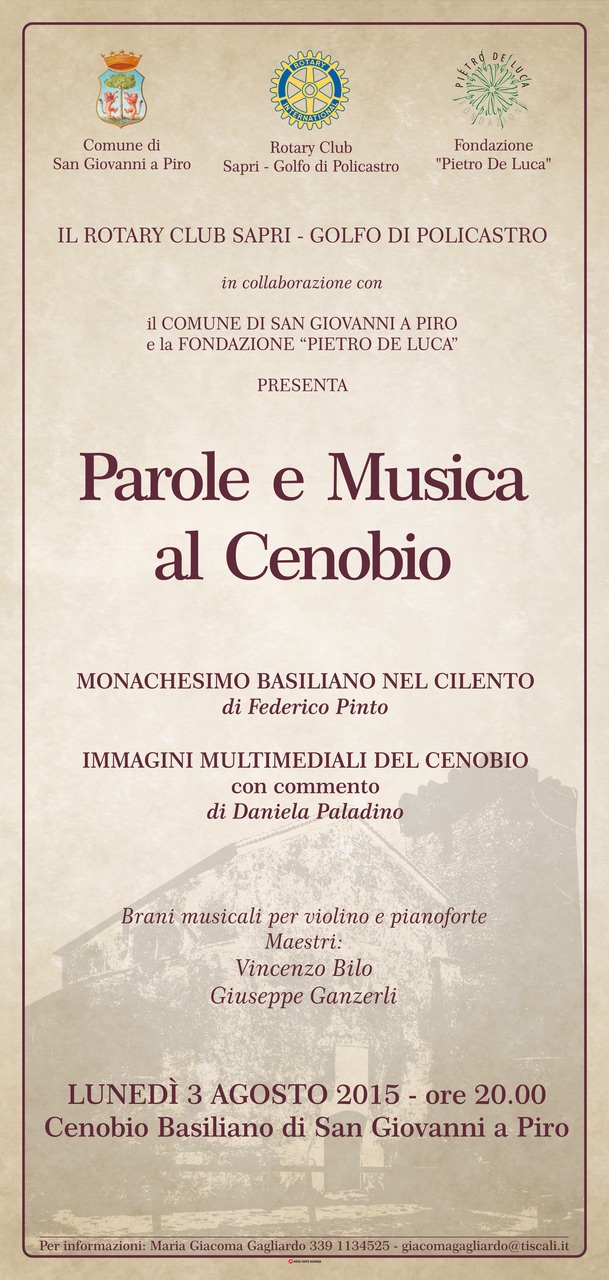 Il Rotary Club Sapri - Golfo di Policastro, in collaborazione con il Comune di San Giovanni a Piro e la Fondazione Pietro De Luca, presenta: "Parole e Musica al Cenobio". L'evento culturale si terrà lunedì 3 c.m., presso il Cenobio italo-bizantino di San Giovanni a Piro, alle ore 20. Durante la serata Federico Pinto esporrà ai presenti il tema "Monachesimo basiliano nel Cilento", mentre Daniela Paladino commenterà alcune immagini multimediali del Cenobio. La manifestazione vedrà la partecipazione dei maestri Vincenzo Bilo e Giuseppe Ganzerli, che si esibiranno in brani musicali al violino e pianoforte.