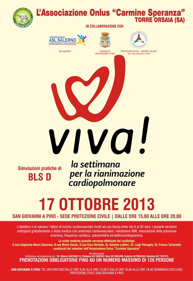 L'associazione Onlus Carmine Speranza partecipa alla campagna di prevenzione " Viva 2013 ", in collaborazione con la Protezione Civile coordinamento Gruppo Lucano, Conacuore di Modena, I.R.C Bologna, Asl Salerno e il Comune di San Giovanni a Piro.