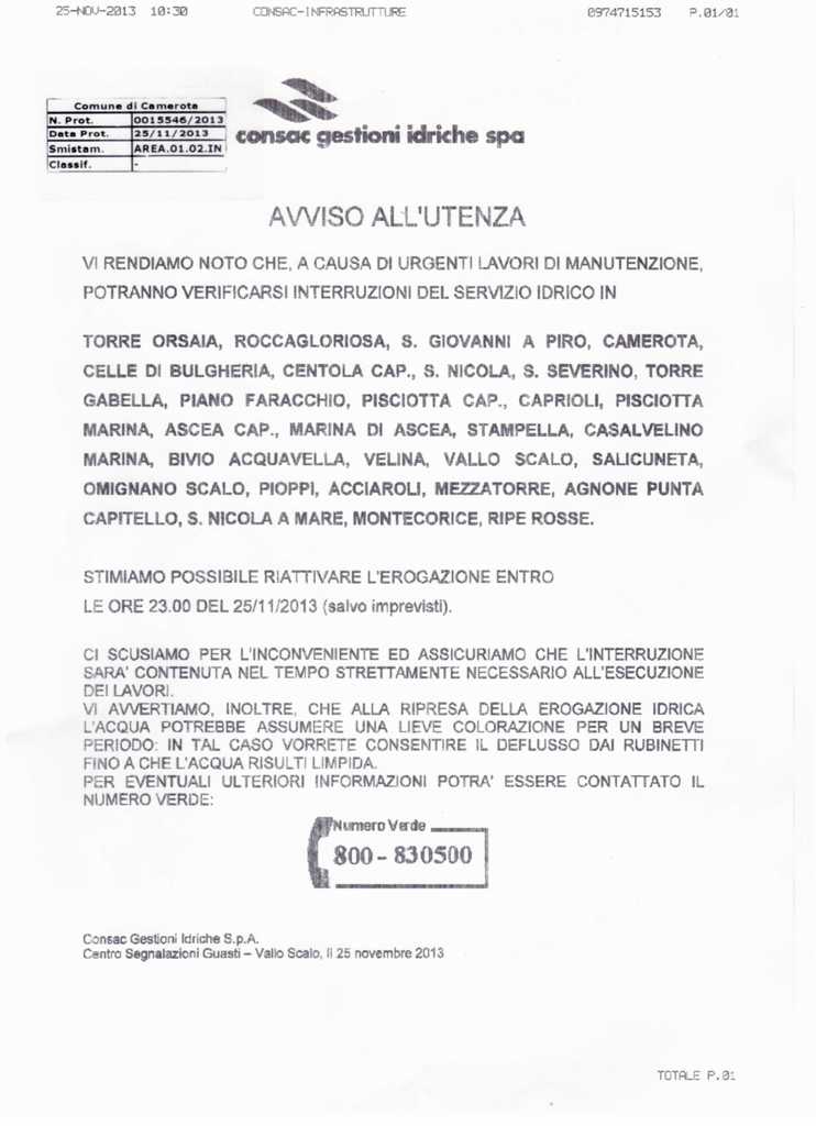 Stimiamo possibile riattivare l' erogazione entro le ore 23.00 del 25/11/2013 (salvo imprevisti) ci scusiamo per l'inconveniente ed assicuriamo che l'interruzione sarà contenuta nel tempo strettamente necessario all'esecuzione dei lavori. vi avvertiamo, inoltre, che alla ripresa della erogazione idrica l'acqua potrebbe assumere una lieve colorazione per un breve periodo, in tal caso vorrete consentire il deflusso dai rubinetti fino a che l'acqua risulti limpida. Per eventuali ulteriori  informazioni potrà essere contattato il numero verde: 800- 830500