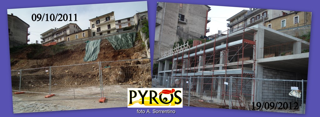 Proseguono i lavori di "riqualificazione aree urbane" in Via del Pozzo a San Giovanni a Piro, con la realizzazione della struttura comunale di box auto- ludoteca. Nella foto lo sviluppo dei lavori nell'arco dell'ultimo anno.