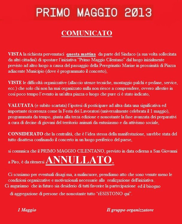 La manifestazione Primo Maggio 2013, che doveva tenersi questa sera a San Giovanni a Piro, è stata annullata. L'organizzazione ha diramato un comunicato ufficiale in cui spiega il motivo della decisione (in allegato). Secondo gli organizzatori i problemi sarebbero nati dalla richiesta del sindaco (sollecitata da alcuni cittadini) di far spostare l'evento "dal luogo inizialmente previsto (la piazzetta adiacente il municipio N.d.R.) ad altro luogo a causa del passaggio della Peregrinatio Mariae" (passaggio che è avvenuto questa mattina, ora la statua della Madonna di Pietrasanta sta sostando nel palazzo della famiglia Trotta sopra il municipio N.d.R.). Viste, poi, le difficoltà tecniche dell'allestimento di un altro luogo, e "considerato che la centralità, che è l'idea stessa della manifestazione, sarebbe stata del tutto disattesa confinando il concerto in un luogo periferico del paese" gli organizzatori hanno optato per l'annullamento della manifestazione.