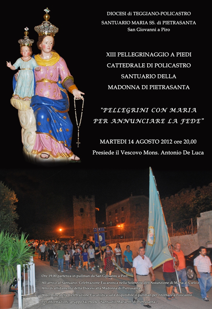 Martedì 14 agosto ore 20,00 XIII Pellegrinaggio a piedi Cattedrale di Policastro - Santuario di Pietrasanta. Alle ore 19,00 partirà il pullman da S. Giovanni a Piro. All'arrivo al Santuario Celebrazione Eucaristica nella Solennità dell' Assunzione di Maria al Cielo e atto di affidamento della diocesi alla Madonna di Pietrasanta. Presiederà il Vescovo Mons. Antonio De Luca. Al Termine della Celebrazione sarà disponibile il pullman per riportare i fedeli a Policastro.