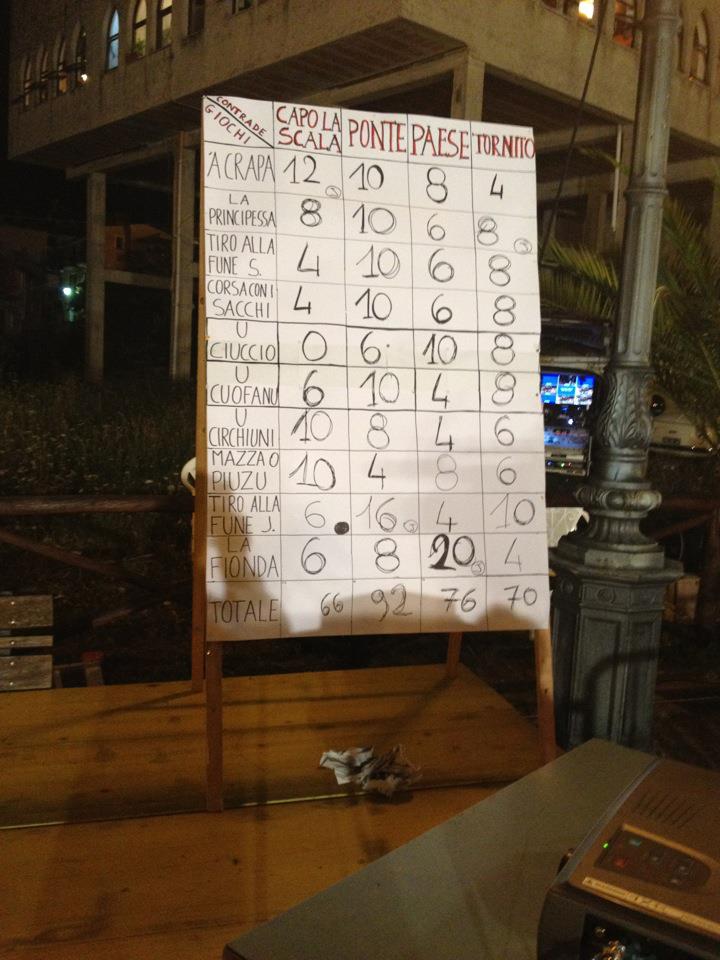 Non solo muscoli. Il rione Ponte si aggiudica la XIII edizione del palio delle contrade, vincendo 5 dei 10 giochi, raggiungendo i 92 punti nella classifica finale. Al secondo posto con 76 punti chiude la contrada Paese, l'unica a fare il pieno di punti giocando il Jolly, grazie al suo arciere Pasquale Cariello. Terza piazza per il rione Tornito con 70 punti, che vince a sorpresa il tiro alla fune junior. A chiudere la classifica la contrada capolascala, con la consolazione del premio "Franchitiello" avendo vinto il gioco della "mazza o piuzo".