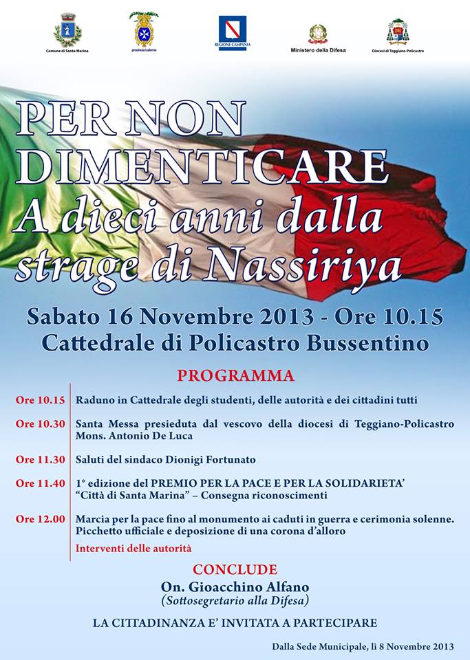 Sabato 16 novembre a Policastro Bussentino si terrà la manifestazione "Per non dimenticare, a 10 anni dalla strage di Nassiriya". A questa speciale giornata, organizzata per la commemorazione dei caduti della strage, parteciperà il Sottosegretario alla Difesa Gioacchino Alfano. L'appuntamento è per le ore 10,15 nella Cattedrale di Santa Maria Assunta, dove il Vescovo della Diocesi di Teggiano Policastro, Mons. Antonio De Luca, Celebrerà la Santa Messa. Al termine della Celebrazione si terrà la prima edizione del Premio per la Pace e la Solidarietà "Città di Santa Marina", prima della Marcia della Pace fino al monumento ai caduti in guerra.