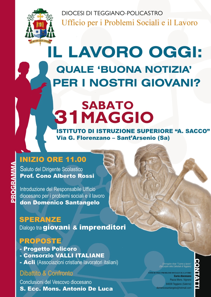 Si terrà domani, sabato 31 maggio, presso l'Istituto di Istruzione Superiore "A. Sacco" di S. Arsenio, alle ore 11:00, l'incontro promosso dall'Ufficio Diocesano di Teggiano Policastro per i Problemi Sociali e il Lavoro sul tema: "Lavoro oggi: Quale 'Buona Notizia' per i giovani?".