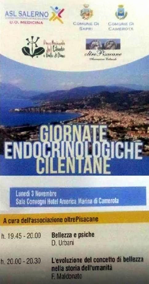 L'ASL Salerno (U.O.Medicina di Sapri), il Comune di Sapri, il Comune di Camerota, il Parco Nazionale del Cilento, Vallo di Diano e Alburni e l'Ass. Oltre Pisacane invitano la cittadinanza tutta all'incontro che si terrà domani, lunedì 3 novembre, a Marina di Camerota (presso la sala convegni hotel America) per le "Giornate Endocrinologiche Cilentane". Al centro dell'incontro il tema della "bellezza", con gli interventi di D.Urbani su "Bellezza e psiche" e di F. Maldonato "sull’evoluzione del concetto di bellezza nella storia dell’umanità".