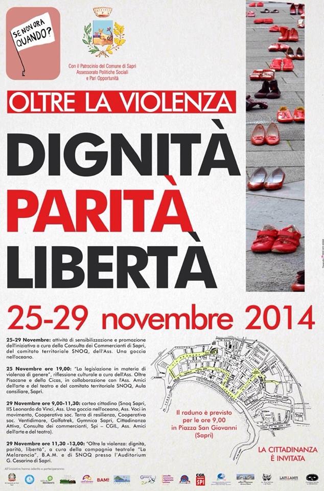 A Sapri, dal 25 al 29 novembre, si terranno delle manifestazioni contro la violenza di genere. L'evento, dal titolo chiarissimo, "Oltre la violenza: dignità, parità, libertà", prevede diversi appuntamenti, come quello di giorno 25 sulla "Legislazione in materia di violenza di genere". La manifestazione si concluderà il 29 con il corteo cittadino e l'evento "Oltre la violenza: dignità, parità, libertà" a cura della Compagnia teatrale "La Melarancia", B.A.M. e di S.N.O.Q. presso l'Auditoriun comunale G. Cesarino.