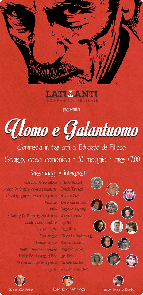 La Compagnia teatrale I Latitanti di Scario il 10 maggio presenterà al pubblico la commedia in tre atti "Uomo e Galantuomo" di Eduardo De Filippo. L'opera verrà messa in scena domenica prossima, alle ore 17:00, presso il piazzale della Casa Canonica di Scario, nel Comune di San Giovanni a Piro. Per un pomeriggio all'insegna dell'allegria...accorrete numerosi!!!