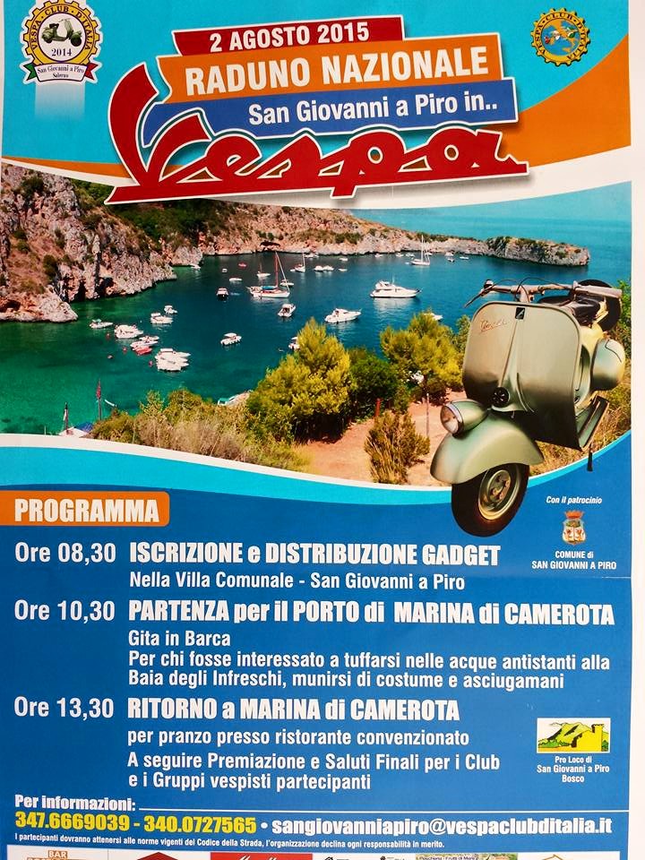 Domenica 2 agosto nel golfo di Policastro si terrà l'annuale raduno nazionale "San Giovanni a Piro in Vespa". L'evento è organizzato dal locale Vespa Club d'Italia, in collaborazione con la Pro-loco e il patrocinio del Comune. Le iscrizioni, con la distribuzione dei gadget, verranno aperte alle 8 e 30 presso la villa comunale di San Giovanni a Piro. La carovana alle 10 e 30 partirà in direzione porto di Marina di Camerota. Arrivati a destinazione i vespisti visiteranno in barca l'Area Marina Protetta degli Infreschi. Al ritorno, dopo il pranzo in un ristorante convenzionato, verranno effettuate le premiazioni con i saluti finali a cura dell'organizzazione.