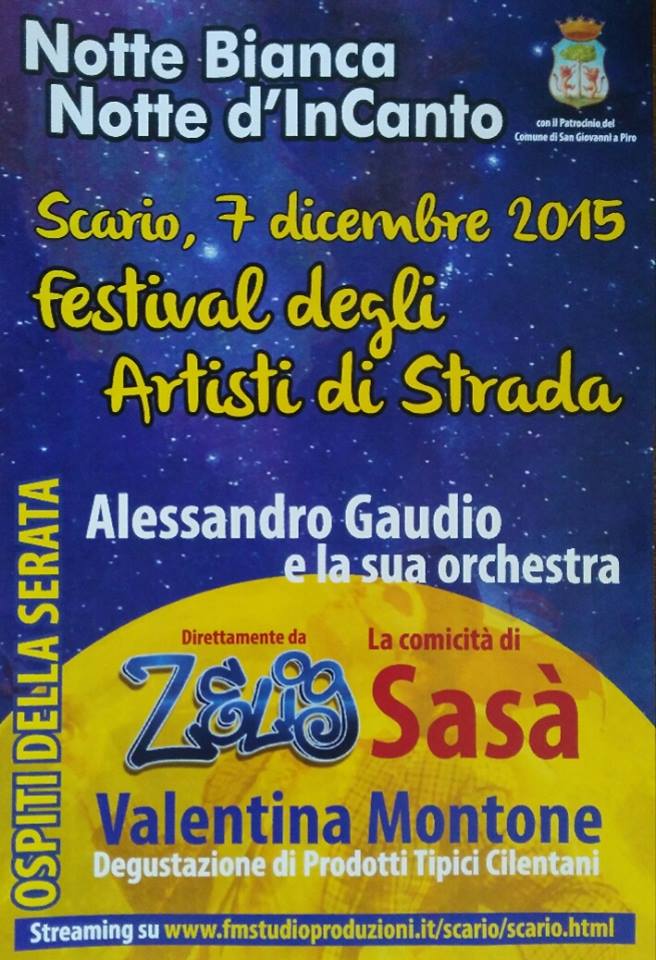 Il 7 dicembre ritorna a Scario la manifestazione "Notte Bianca -Notte d'InCanto". Ospiti dell'evento, patrocinato dal Comune di San Giovanni a Piro, il pluricampione di organetto Alessandro Gaudio con la sua orchestra, il comico Sasà (direttamente da Zelig) e Valentina Montone. Durante la notte bianca si terrà il Festival degli artisti di strada e una degustazione di prodotti tipici cilentani.