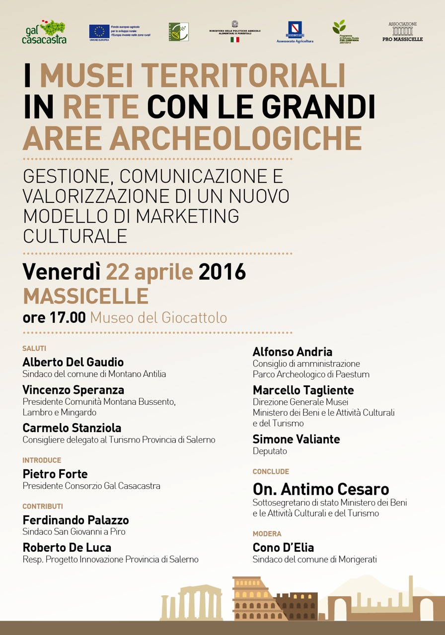Il prossimo 22 aprile a Massicelle, presso il Museo del Giocattolo alle ore 17, si terrà il convegno sul tema "I Musei territoriali in rete con le grandi aree archeologiche - Gestione, comunicazione e valorizzazione di un nuovo modello di marketing culturale". Saluti di Alberto Del Gaudio, Sindaco di Montano Antilia, Vincenzo Speranza, Presidente Comunità Montana Bussento Lambro e Mingardo, Carmelo Stanziola, Consigliere delegato al turismo della Provincia di Salerno. Introduce Pietro Forte, Presidente del Consorzio Gal Casacastra. Contributi di Ferdinando Palazzo, Sindaco di San Giovanni a Piro, Roberto De Luca, Responsabile Progetto Innovazione Provincia di Salerno, Alfonso Andria, Consiglio di Amministrazione Parco Archeologico di Paestum, Marcello Tagliente, Direzione Generale Musei Ministero dei Beni e le Attività Culturali e del Turismo, Simone Valiante, Deputato. Conclude l'On. Antimo Cesaro, Sottosegretario di stato Ministero dei Beni e le Attività Culturali e del Turismo. Modera Cono D'Elia, Sindaco di Morigerati.