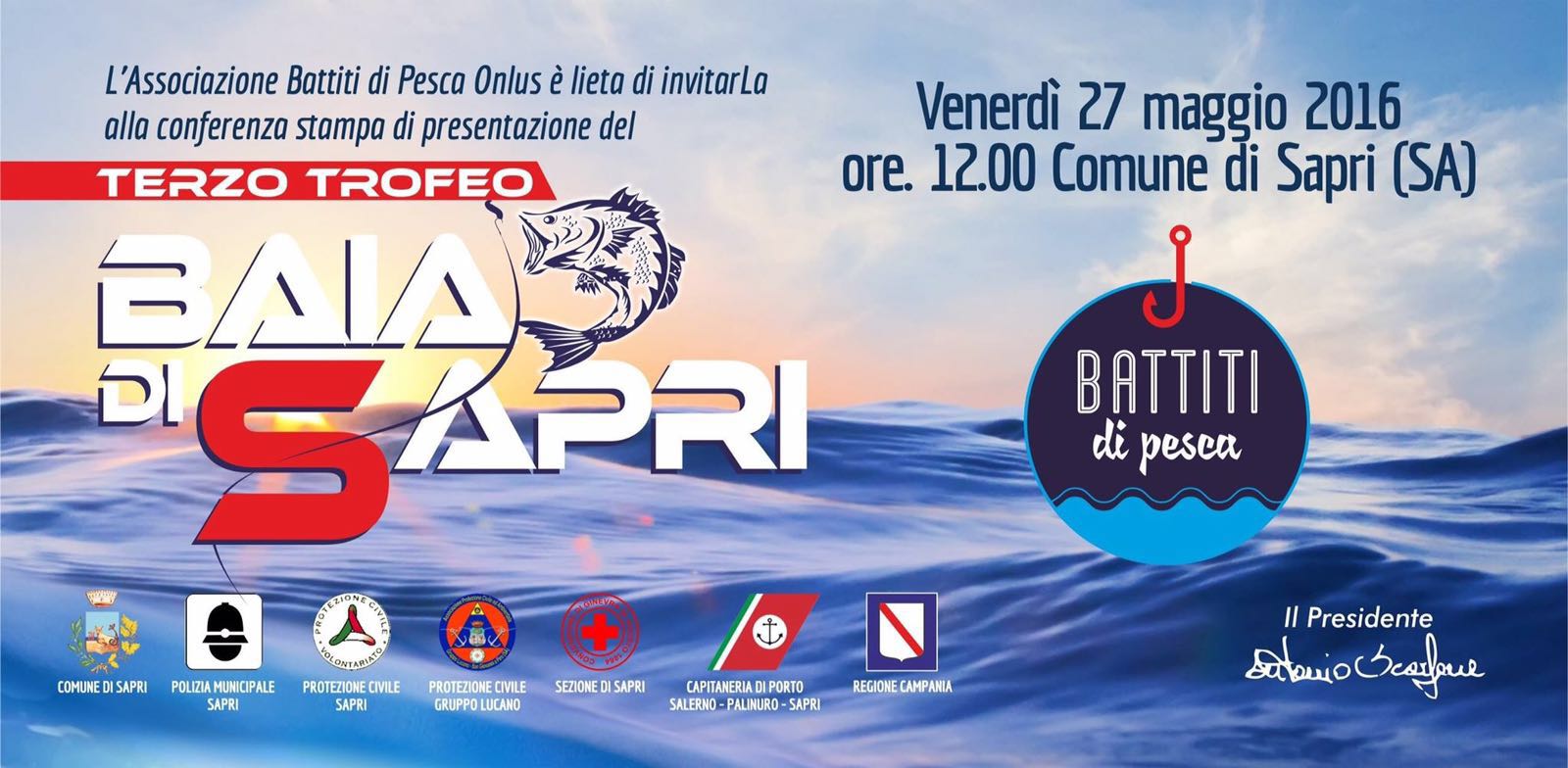 L’incantevole mare della città della Spigolatrice farà da scenario, domenica 29 maggio 2016, al trofeo di pesca sportiva “Baia di Sapri”, giunto alla sua 3^ edizione ed organizzato dall’associazione onlus “Battiti di Pesca” in collaborazione con Comune di Sapri, Comando Polizia Locale di Sapri, Protezione Civile Sapri, Protezione Civile Gruppo Lucano, Croce Rossa sezione di Sapri, Capitaneria di Porto Salerno-Palinuro-Sapri e Regione Campania.