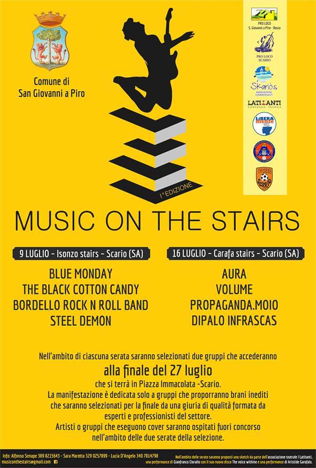 Sabato 16 luglio si terrà a Scario la seconda serata del contest musicale Music on The Stairs organizzato dal Comune di San Giovanni a Piro, in collaborazione con le associazioni locali. Dopo il successo di sabato scorso, 9 luglio, le band si esibiranno ancora sulle scale di Vico Isonzo a Scario, nella meravigliosa cornice del Lungomare Marconi. I due gruppi che verranno selezionati accederanno alla finale del 27 luglio insieme ai Blue Monday e gli Steel Demon che hanno superato il turno durante la prima serata. Le band verranno giudicate da una giuria di qualità composta da esperti e professionisti del settore. Fuori concorso le esibizioni di artisti e band che proporranno cover.