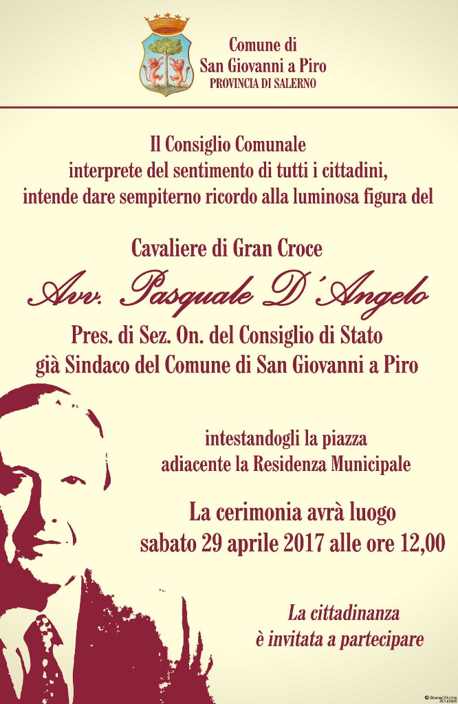 "Il Consiglio Comunale, - leggiamo nell'invito alla cittadinanza - interprete del sentimento di tutti i cittadini, intende dare sempiterno ricordo alla luminosa figura del Cavaliere D'Angelo, Pres. di Sez. On. del Consiglio di Stato, già Sindaco del Comune di San Giovanni a Piro, intestandogli la Piazza adiacente la Residenza Comunale".