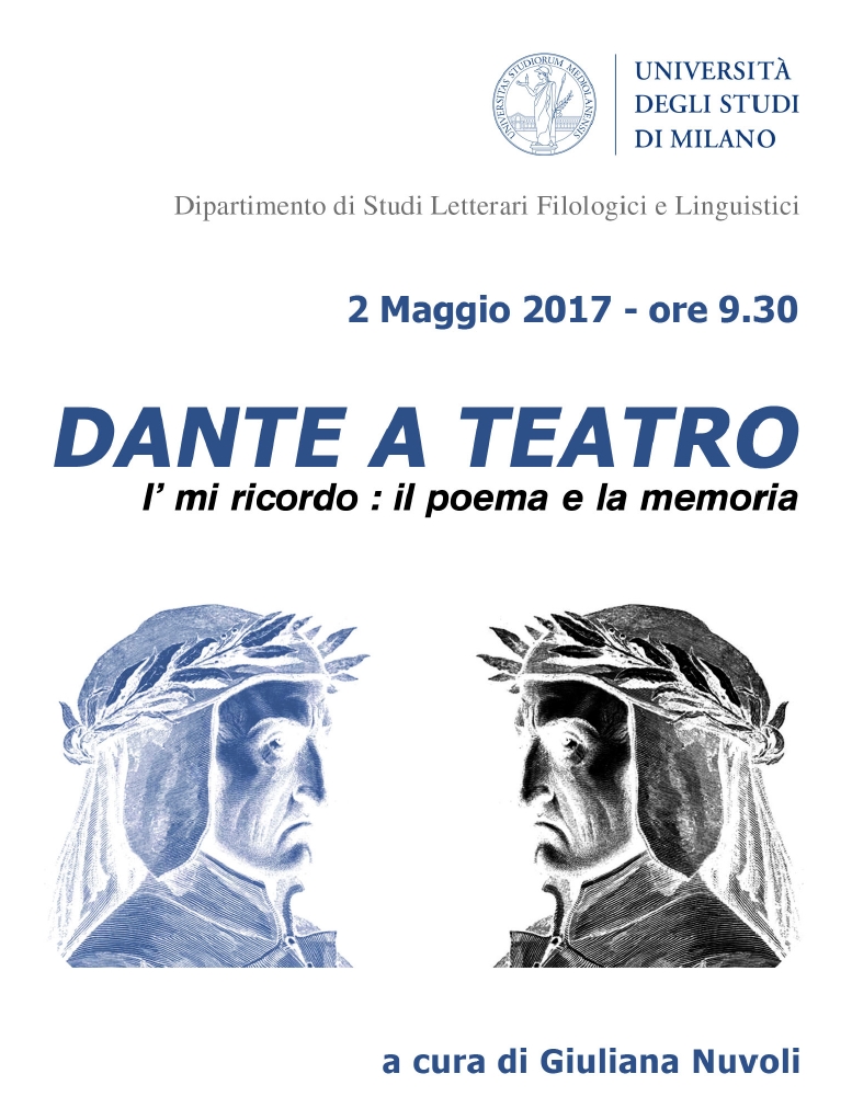 Il 2 maggio torna, nell'Aula Magna dell'Università degli Studi di Milano, Dante a teatro, iniziativa per studenti delle scuole e universitari e cittadini, promossa dal dipartimento di Studi letterari, filologici e linguistici e curata da Giuliana Nuvoli, docente di Letteratura italiana in Statale.