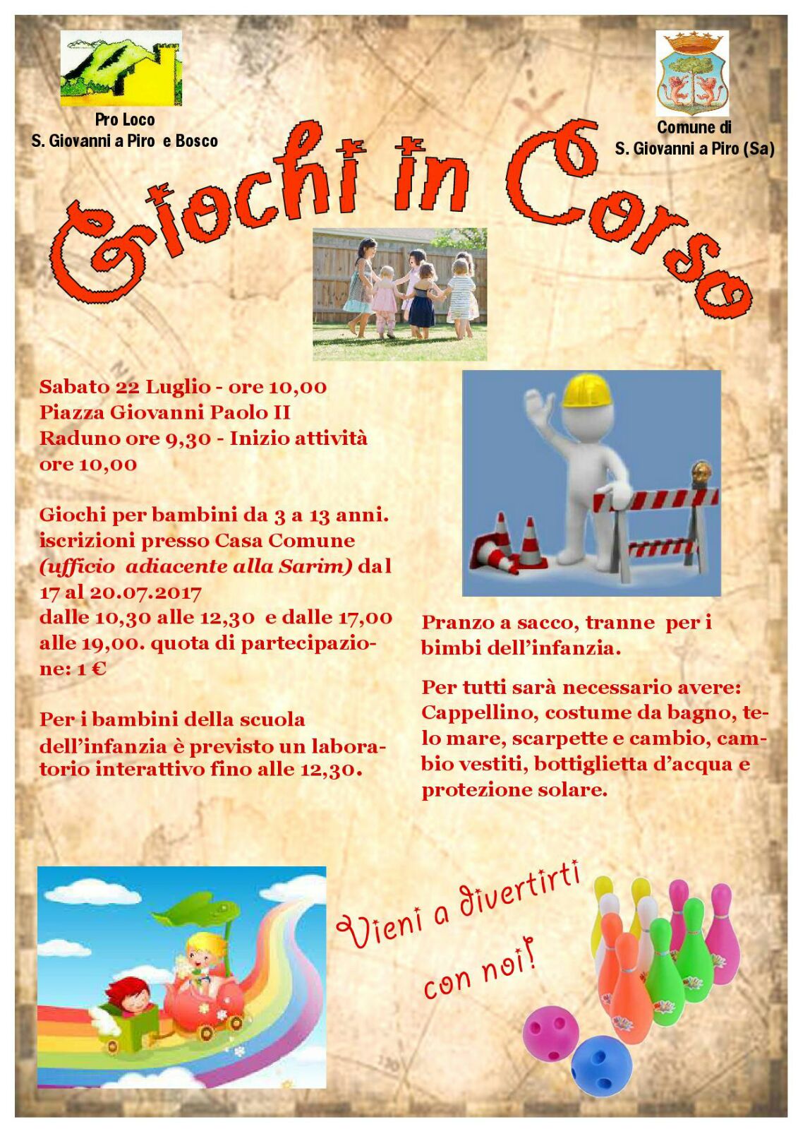 Una giornata di giochi e divertimento per i più piccoli (3-13 anni) in Piazza Giovanni Paolo II a San Giovanni a Piro. Questa l'idea di "Giochi in corso", manifestazione organizzata dalla Pro loco San Giovanni a Piro Bosco, in collaborazione con il Comune, che avrà luogo nella giornata di sabato 22 luglio.