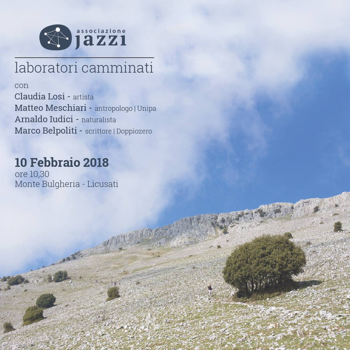 Il 10 febbraio il Monte Bulgheria sarà teatro di un nuovo evento dell'Associazione Jazzi: il Laboratorio camminato. L’artista Claudia Losi, l'antropologo dell'Unipa Matteo Meschiari, il naturalista Arnaldo Iudici e lo scrittore Marco Belpoliti, saranno i protagonisti di questo primo progetto del 2018 dell'Associazione. La camminata avrà inizio alle ore 10 e 30 dalla chiesa dell’Annunziata di Licusati.