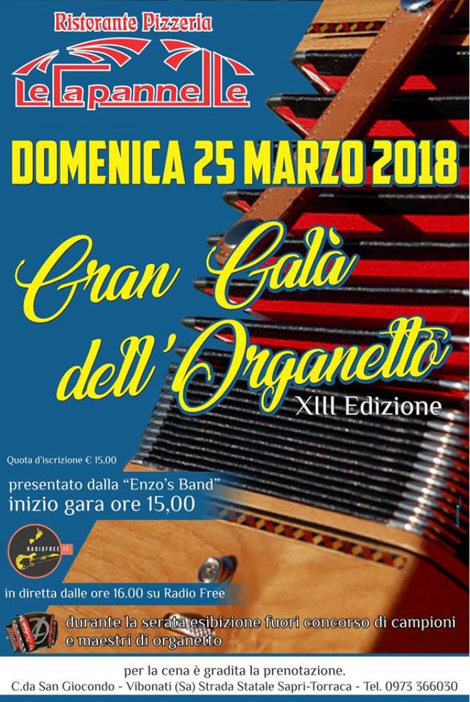 A Vibonati si rinnova l’appuntamento al suono di uno degli strumenti per antonomasia della tradizione popolare. Domenica 25 marzo 2018, festività delle Palme, il suggestivo salone delle feste delle Capannelle, sulla strada provinciale tra Sapri e Torraca, ospiterà oltre un centinaio di concorrenti provenienti dall’intero Sud Italia per la 13^ edizione del Gran Galà dell’Organetto: tutti pronti a darsi battaglia nel torneo interregionale organizzato da Enzo Lovisi e dalla sua Enzo’s live band.
