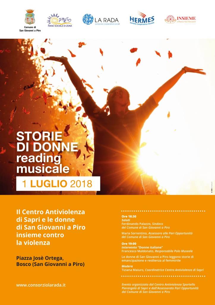 L’evento inizierà alle 18:30 con i saluti di Ferdinando Palazzo, Sindaco di San Giovanni a Piro e di Maria Sorrentino, Assessora alle Pari Opportunità. Alle 19:00 ci sarà un intervento di Franco Maldonato, Responsabile del Polo Museale di San Giovanni a Piro, sul tema della figura femminile nel Risorgimento e sul ruolo che donne coraggiose svolsero in questo periodo storico. Seguiranno le letture ed alcune canzoni eseguite da donne di San Giovanni a Piro. Le donne quindi saranno le protagoniste di questo evento, le donne del territorio innanzitutto, capaci di dare voce a storie che parlano dell’essere madri, lavoratrici, mogli e, soprattutto, libere. Musica e parole per sostenere le donne contro gli stereotipi e la violenza di genere. Storie di donne è organizzato dal Centro Antiviolenza “Iris - Sportello Pierangela” di Sapri (Ambito Sociale S9) e dall’Assessorato Pari Opportunità del Comune di San Giovanni a Piro.