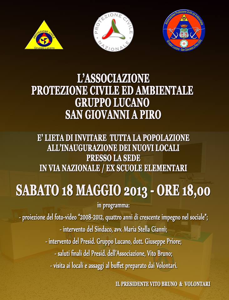 Il prossimo sabato, giorno 18 maggio, l'Ass. Protezione Civile ed Ambientale Gruppo Lucano San Giovanni a Piro inaugurerà, alle 18:00 i nuovi locali della sede di via Nazionale. In programma la proiezione del foto - video "2008-2012, quattro anni di crescente impegno nel sociale", gli interventi del Sindaco Giannì e del Presidente del Gruppo Lucano, Giuseppe Priore, i saluti del Presidente dell'Associazione, Vito Bruno, e la visita ai locali con annesso buffet. Tutta la popolazione è invitata all'evento.