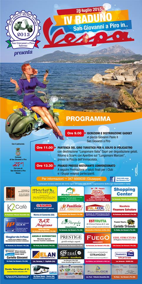 Gli "Amici della Vespa" di San Giovanni a Piro organizzano per il 28 luglio una passeggiata in vespa nel Golfo di Policastro. Il raduno, giunto alla quarta edizione, è fissato per le ore 9:00 in Piazza Giovanni Paolo II a San Giovanni a Piro. La partenza sarà per le ore 11:00, poi tutti in viaggio per le strade del Golfo. Il pranzo sarà organizzato presso un ristorante convenzionato. Per info vedere il manifesto in allegato, oppure telefonare al 3476669030 o su Facebook sul gruppo Amici della Vespa.
