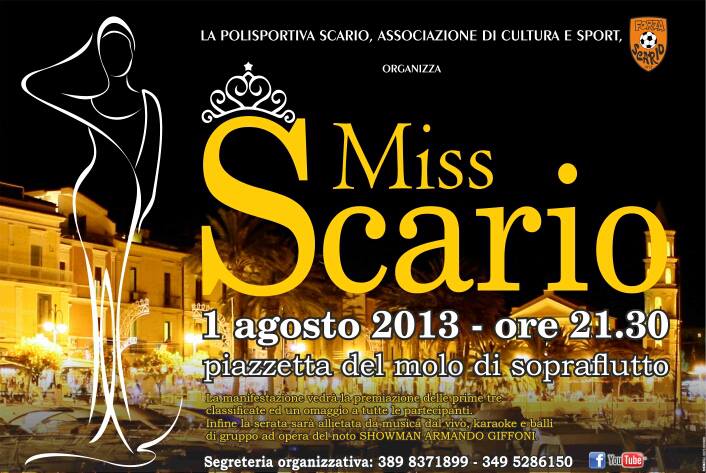 La Polisportiva Scario organizza, come da recente tradizione, il concorso di bellezza Miss Scario. L'evento si terrà il primo agosto, nella piazzetta del molo di sopraflutto, dalle 21:30. La serata sarà allietata da musica dal vivo, karaoke e balli di gruppo ad opera di Armando Giffoni. Nella giuria del concorso ci sarà anche il Direttore di questa testata, l'Avv. Salvatore Paradiso.